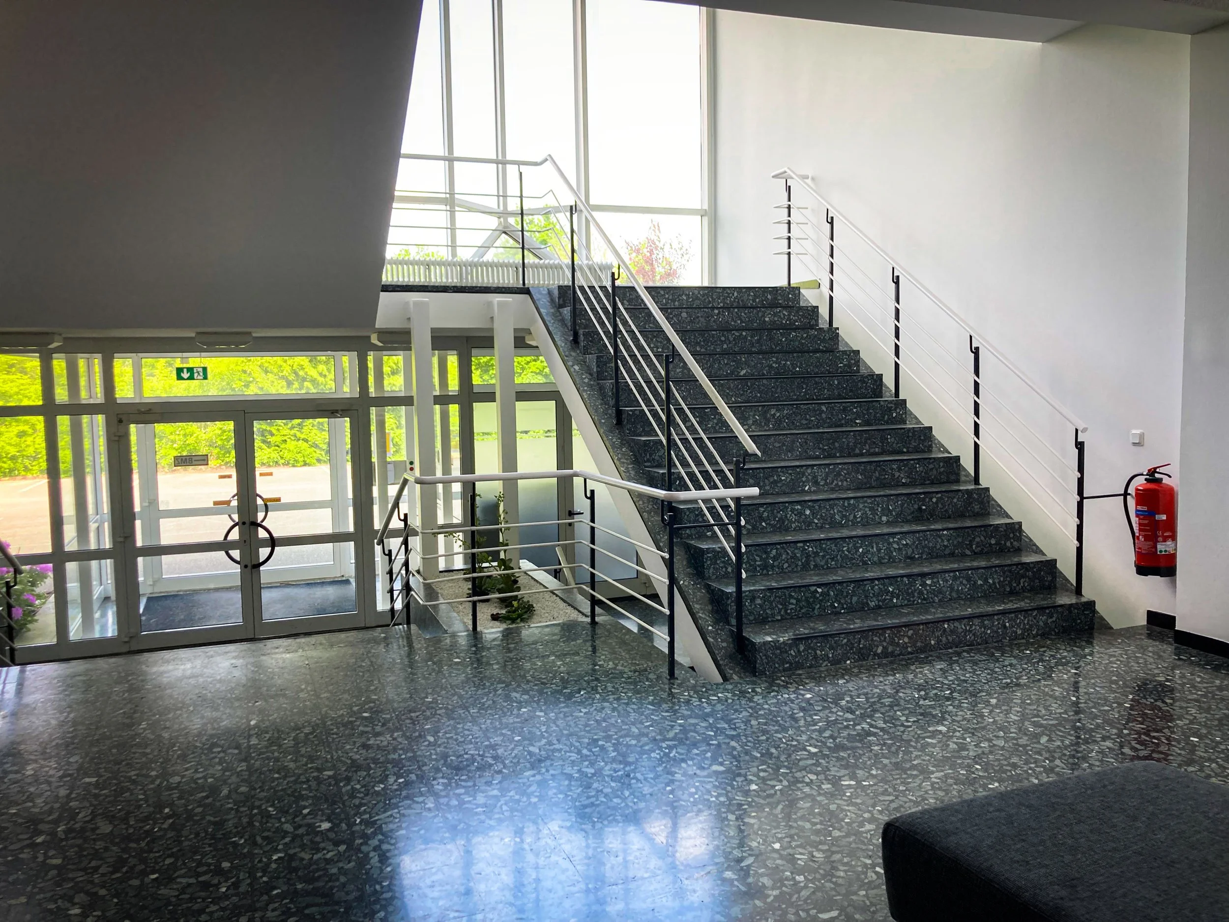 Das Gebäude 1 besticht durch einen repräsentativen Eingangsbereich, der Ihre Besucher sofort willkommen heißt. Ein großzügiges Treppenhaus verbindet alle Etagen und sorgt für einen bequemen Zugang. Für die An- und Ablieferung stehen Ihnen 9 Rampen und ein ebenerdiges Tor zur Verfügung, wodurch eine effiziente Logistik gewährleistet ist. Ein Lastenfahrstuhl verbindet das Untergeschoss mit dem Erdgeschoss, was den Transport schwerer Güter erleichtert.